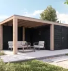 - Wandelementen uit blokhutprofiel met dikte 28 mm.