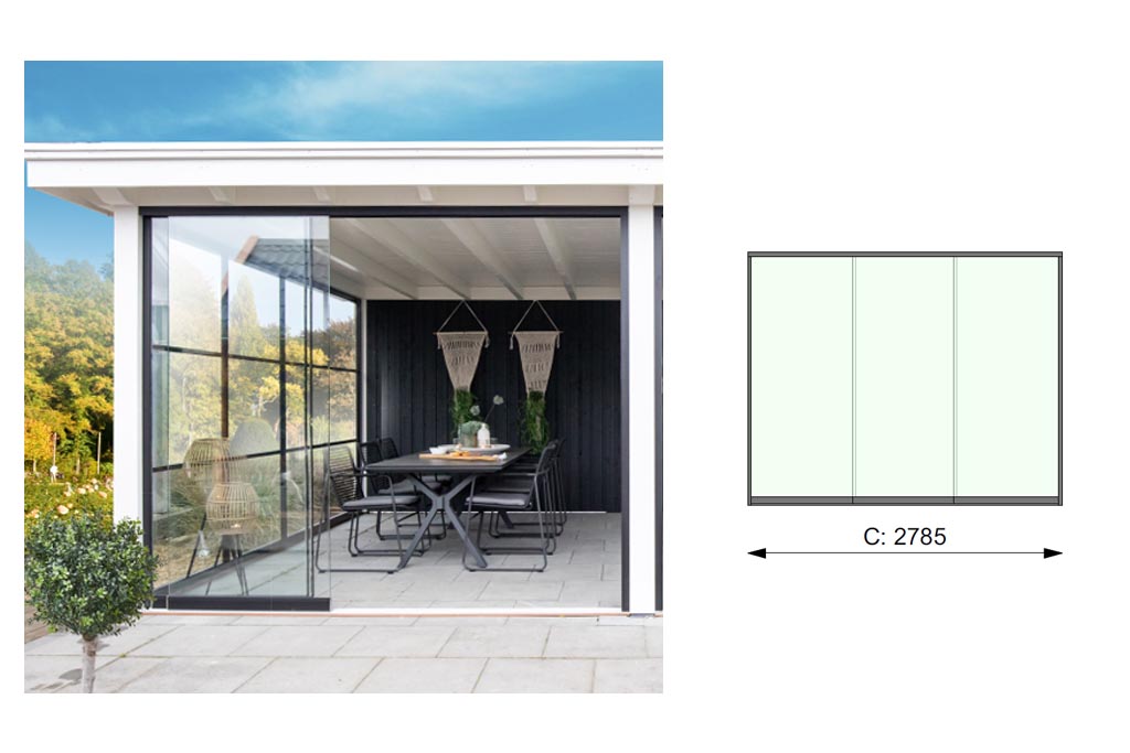 Glazen schuifwand C, 278,5 x 224 cm.