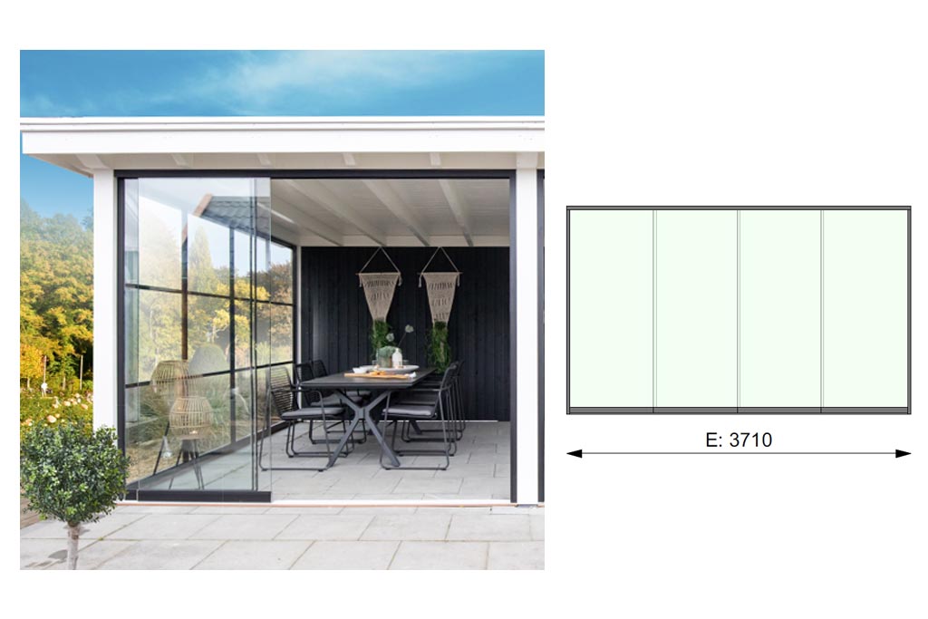 Glazen schuifwand E, 371 x 224 cm.